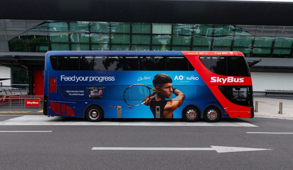 SkyBus is a premium airport transfer running between Melbourne Airport and the CBD (Southern Cross Station), giving brands a high-frequency, high-visibility canvas to share their messages. This season, multiple Australian Open official partners tapped into the energy via SkyBus wraps in Melbourne including Waterdrop, Jacob’s Creek, YoPRO, and Canadian Club.